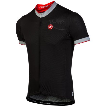 When Americans think of hill climbing prizes, KOM (King of the Mountains) comes to mind. In Italy, the prize is GPM, Gran Premio della Montagna. Castelli's GPM Full Zip Jersey is a fine maglia to wear when scooting up steep hills to steal mountain points from your friends. You love them, but sometimes you have to beat them. It's for their own good.The GPM is probably the least flashy jersey in the Castelli lineup, but it still stands out with the classic close Castelli fit, grey caps on the sleeves and collar, and of course, their scorpion logo.The GPM Jersey is similar to the Prologo jersey in terms of fit and material. The differences are that the GPM uses 100% Stratus fabric with Prosecco treatment. There are no contrasting color panels, the collar and sleeves are topped with seamless micro fiber fabric for comfort and grip, and there's a silicone gripper at the waist hem. Castelli also thought to include a full-length zipper (FZ) with a cam-lock on the pull. Open up the zipper and you can pull open the jersey without tugging on the zipper. Lock down the cam, and the pull will stay in place.Castelli's Stratus fabric with Prosecco treatment looks simple. But the engineering behind it is impressive. Stratus is a dual-layer 100% polyester knit weave. The inner layer is a multifilament web that moves moisture from your skin or base layer to the outside of the fabric. The outer layer is a micro fiber weave that allows sweat to evaporate in the wind. Prosecco is a treatment that helps water disperse and evaporate faster, rather than staying in the jersey. There are three standard rear pockets with the Castelli scorpion on the middle pocket and a fourth, mini-zip pocket built into the right rear. The Castelli logo is also on the shoulder.The Castelli GPM Full Zip Short Sleeve Jersey comes in Black, Cyan, Red, and White. Sizes run from Small to XX-Large.
