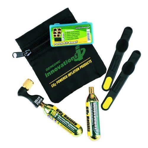 Everything you need to repair and inflate a tire. In a convenient wallet pack. This kit contains a Genuine Innovations Microflate CO2 inflator, two 16 gram threaded ...